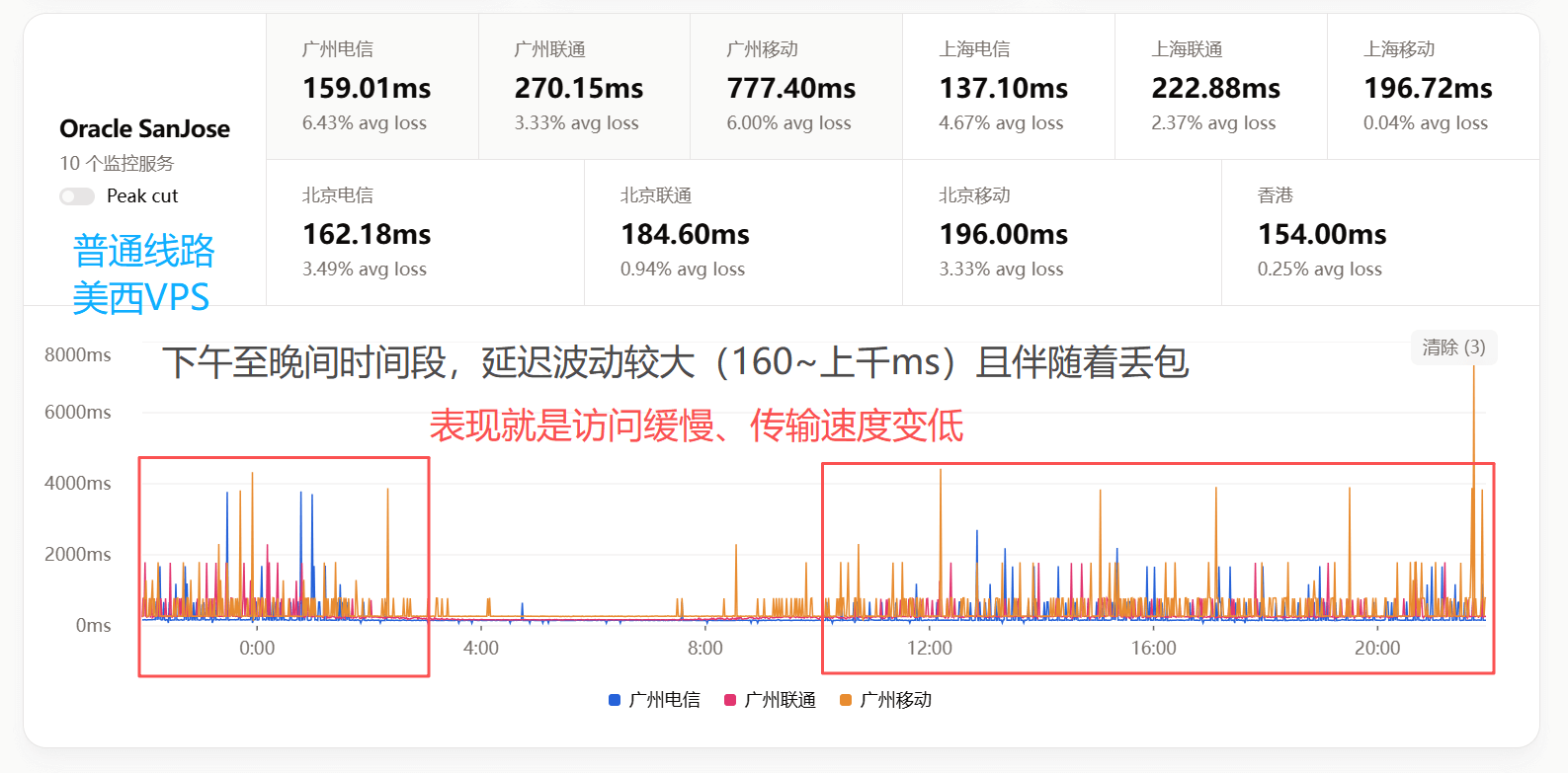 探针表现也非常稳定,全天候 PING 值基本没啥变动(如果是普通路线的话,晚高峰期会 Ping 值高,降速严重)。