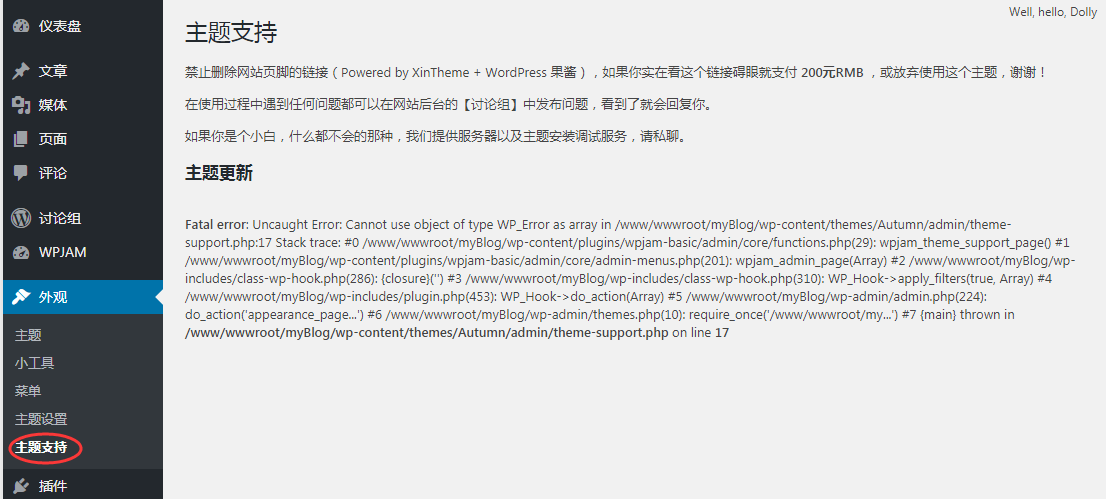 Fatal error: Uncaught Error: Cannot use object of type WP_Error as array in /www/wwwroot/myBlog/wp-content/themes/Autumn/admin/theme-support.php:17 Stack trace: #0 /www/wwwroot/myBlog/wp-content/plugins/wpjam-basic/admin/core/functions.php(29): wpjam_theme_support_page() #1 /www/wwwroot/myBlog/wp-content/plugins/wpjam-basic/admin/core/admin-menus.php(201): wpjam_admin_page(Array) #2 /www/wwwroot/myBlog/wp-includes/class-wp-hook.php(286): {closure}('') #3 /www/wwwroot/myBlog/wp-includes/class-wp-hook.php(310): WP_Hook->apply_filters(true, Array) #4 /www/wwwroot/myBlog/wp-includes/plugin.php(453): WP_Hook->do_action(Array) #5 /www/wwwroot/myBlog/wp-admin/admin.php(224): do_action('appearance_page...') #6 /www/wwwroot/myBlog/wp-admin/themes.php(10): require_once('/www/wwwroot/my...') #7 {main} thrown in /www/wwwroot/myBlog/wp-content/themes/Autumn/admin/theme-support.php on line 17
